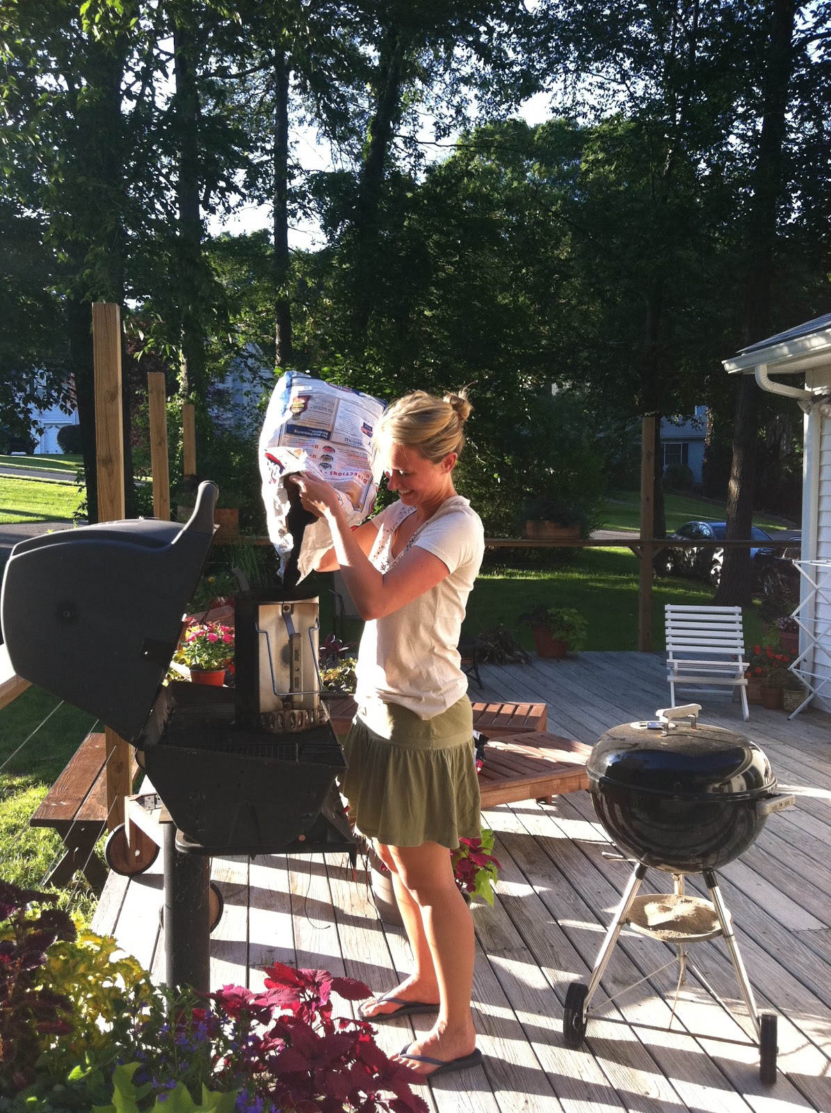 Ok, so lets get to the grilling of the chicken. It was is somewhat ironic that accompanying the chicken recipe in the July issue of Bon Appetit was a column by Jenny Rosenstrach who is also the author of one of my favorite food blogs "Dinner: A Love Story" talking about how she had this fear of grilling even though she is a fantastic cook. Well let's just say that as I was reading this column I felt like I was having this deja vu moment where I was describing my own fears of cooking on the grill and in my feminist view of my life I was not going to go down for being a crappy griller so thank you Jenny for helping me out on this one. Look there are many things that I feel like I can cook just fine on a gas grill (which is our usual grilling method) but when we get into the world of charcoal grilling this is where it can start to go down in flames for me. We actually own a small charcoal grill that we bought a few years ago in Vermont and I fully admit that we do not use it nearly as much as we should and the reason for that is that before Friday, I couldn't tell you how you lit a charcoal grill properly but Suzanne helped me put it all together being the expert that she is at this skill.